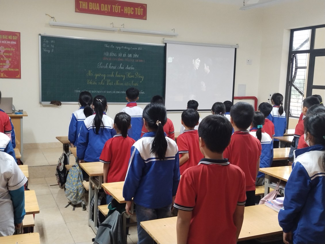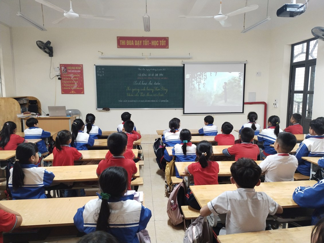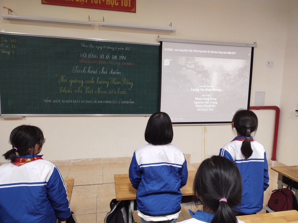Để hưởng ứng hoạt động, các lớp đã cho các em học sinh ôn lại tiểu sử Anh hùng liệt sĩ Kim Đồng – Người đội trưởng đầu tiên của Đội TNTP Hồ Chí Minh về quá trình tham gia cách mạng, lòng yêu nước, sự hy sinh anh dũng với tinh thần “Tuổi nhỏ chí lớn” của anh qua bộ phim hoạt hình "Anh Kim Đồng - Tuổi nhỏ chí lớn".