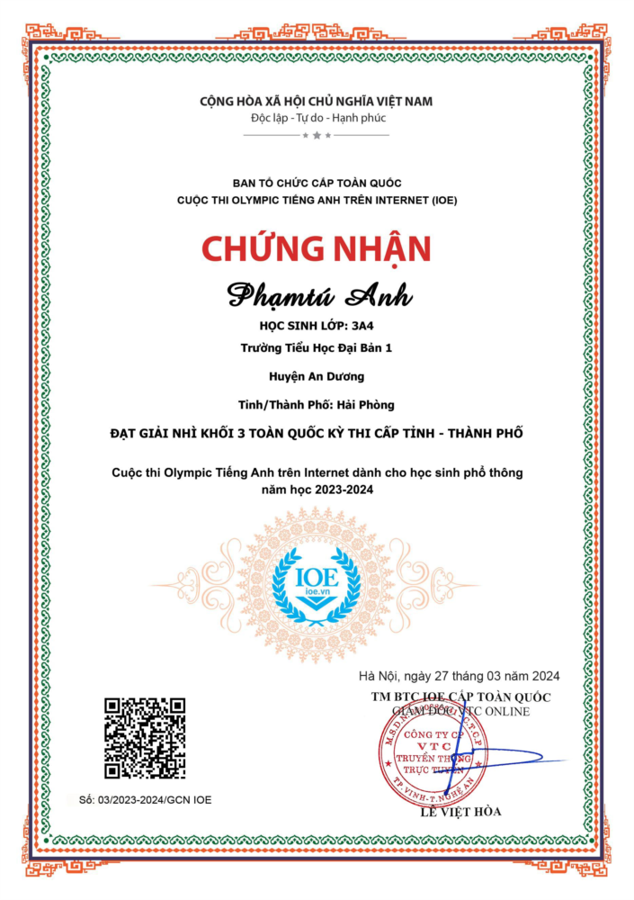 Xin chúc mừng các em học sinh đã đạt giải trong kỳ thi Olympic Tiếng Anh (IOE) cấp thành phố năm học 2023-2024.